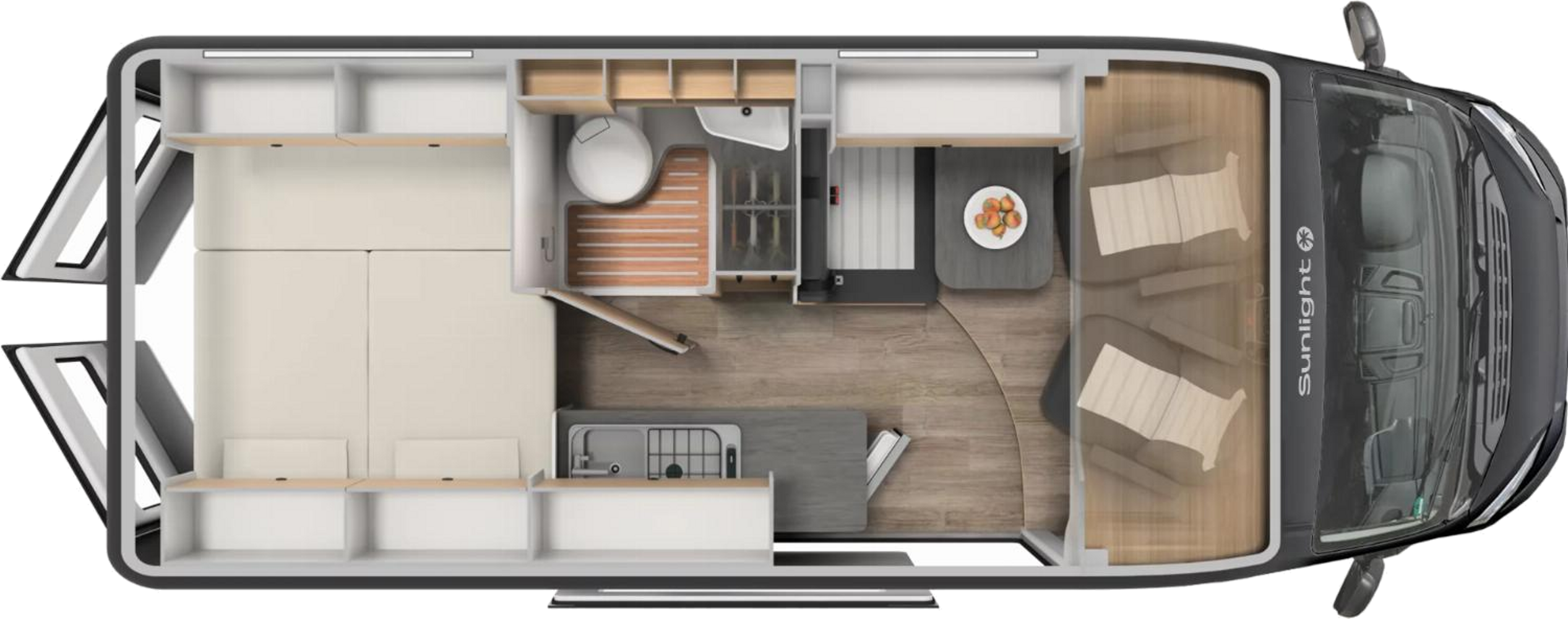 Prachtige integraal camper met 2-enkele bedden en hefbed.